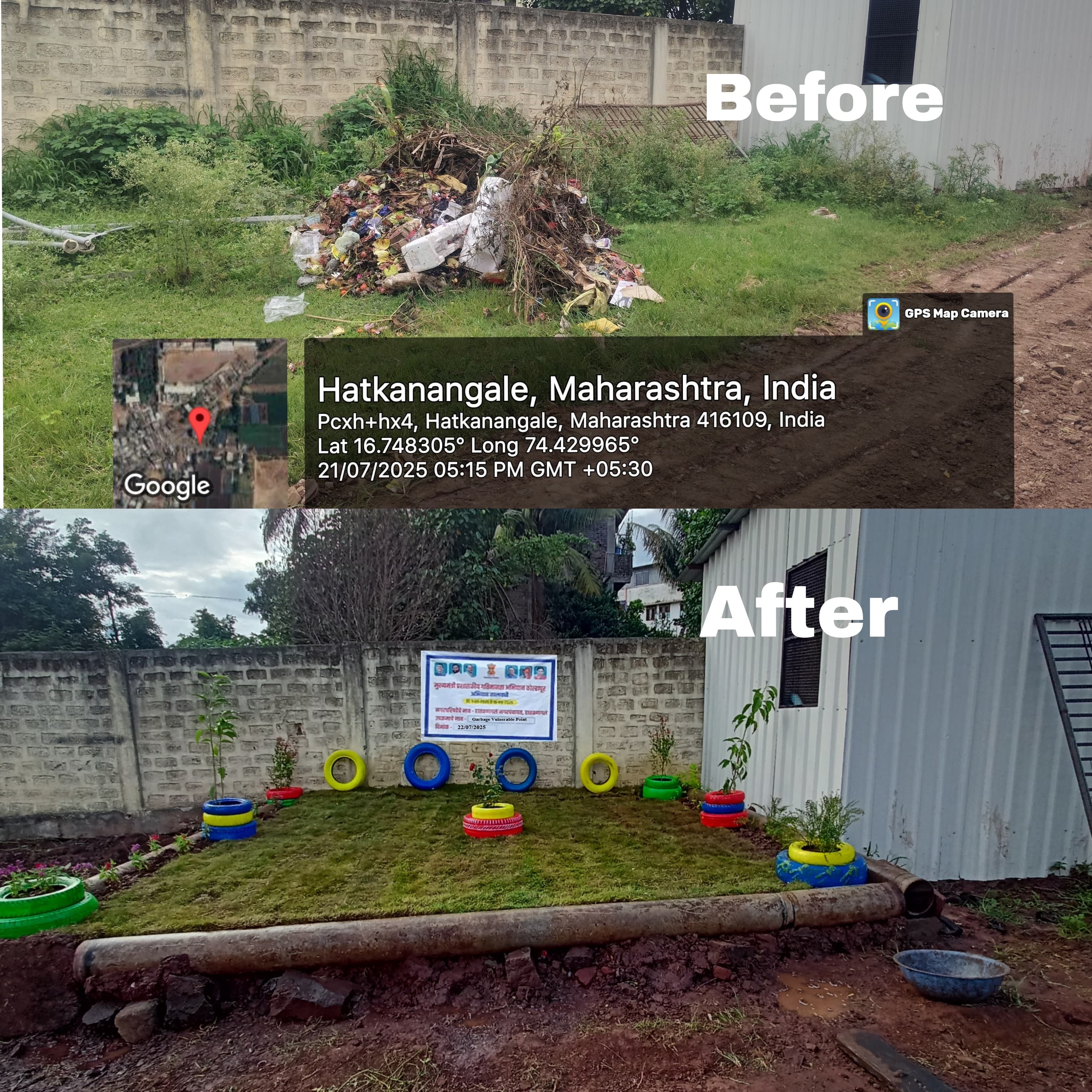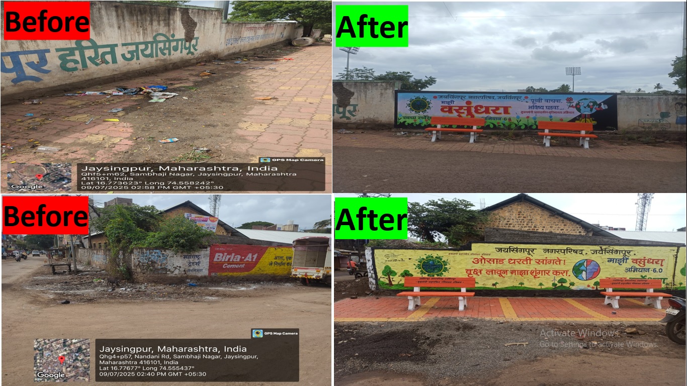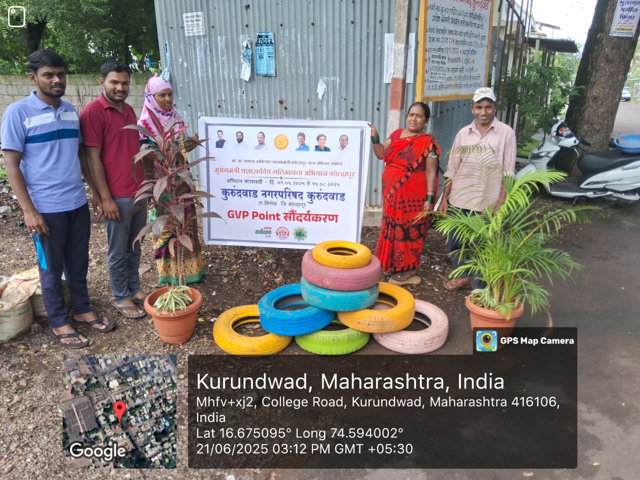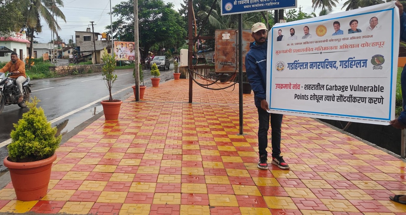 मुख्यमंत्री प्रशासकीय गतिमानता कार्यक्रम अंतर्गत GVP विकसित करणेच्या अनुषंगाने अभियान कालावधीत केलेल्या कार्यवाहीचा तपशील - गडहिंग्लज नगरपरिषद हद्दीतील लाखेनगर पुलाजवळ शहराच्या दर्शनी भागात रिकाम्या जागेत रस्त्याकडेला कचरा पडून विद्रुपीकरण होत होते. मुख्यमंत्री प्रशासकीय गतिमानता कार्यक्रम अभियान कालावधी मध्ये रिकाम्या जागेत कॉक्रीटीकरण करुन पेव्हींग ब्लॉक बसवुन तसेच शोभिवंत रोपे लावून सौदर्यीकरण केलेले आहे.सदरचे काम माझी वसुंधरा अभियान अंतर्गत बक्षीस रककमेतुन करणेत आले आहे. गडहिंग्लज नगरपरिषदकडे काळू मास्तर विद्यालय येथे समोरील पडजागेत नागरीक कचरा टाकुन घाण करत होते. ती जागा शाळेच्या दर्शनी भागात असलेने रिकाम्या जागेत कचरा पडुन विद्रुपीकरण झालेले होते. त्यामुळे या ठिकाणी शाळेसमोरील जागेत माझी वसुंधरा अभियान अंतर्गत बक्षीस रक्कमेतुन सुशोभिकरण केले आहे.