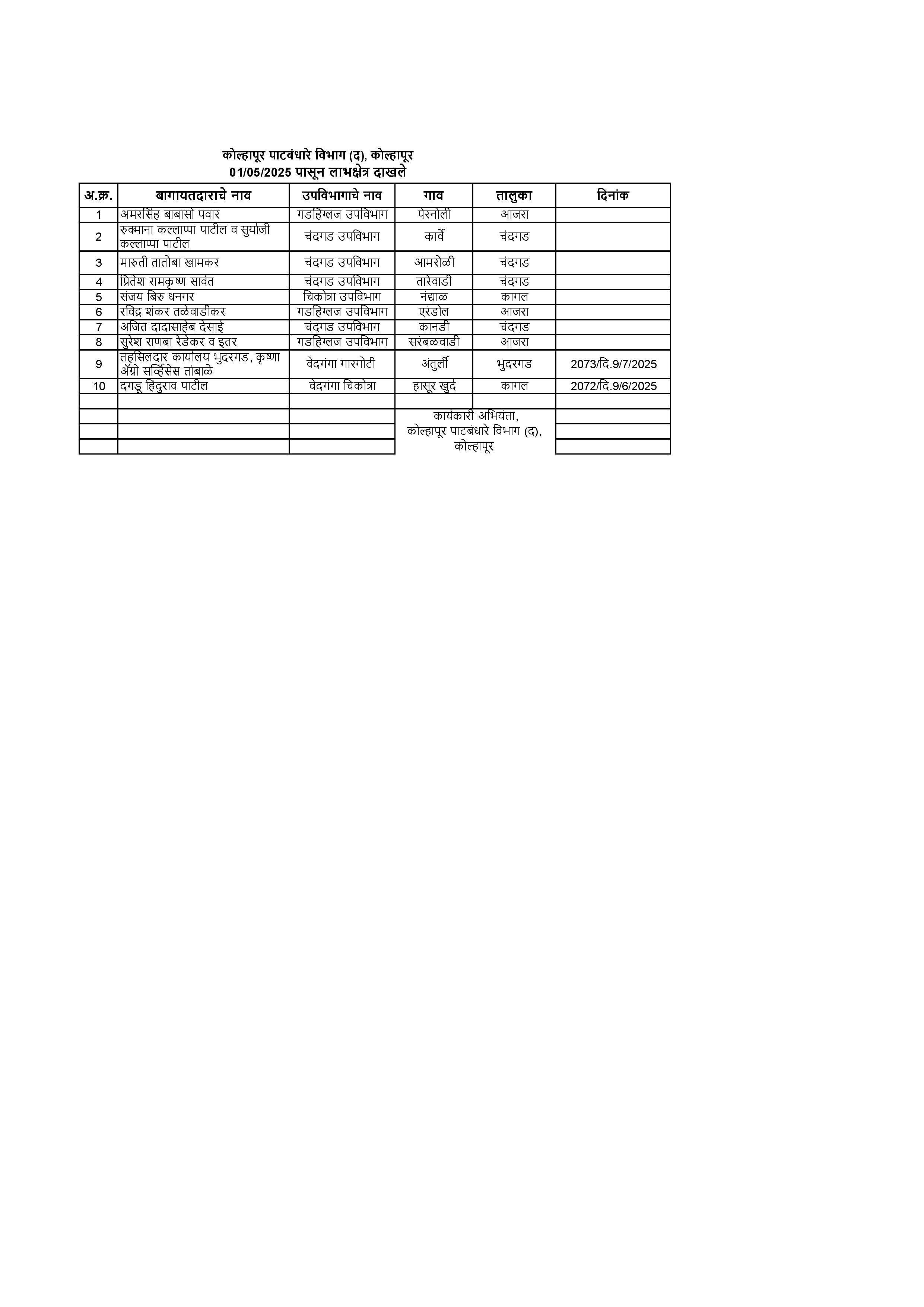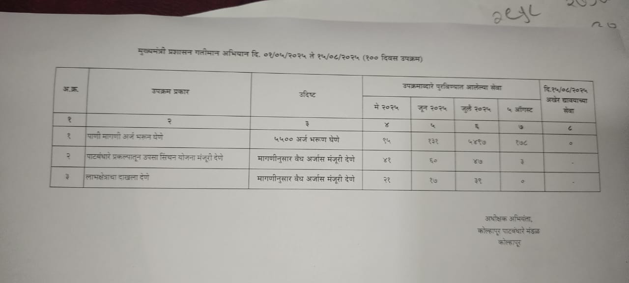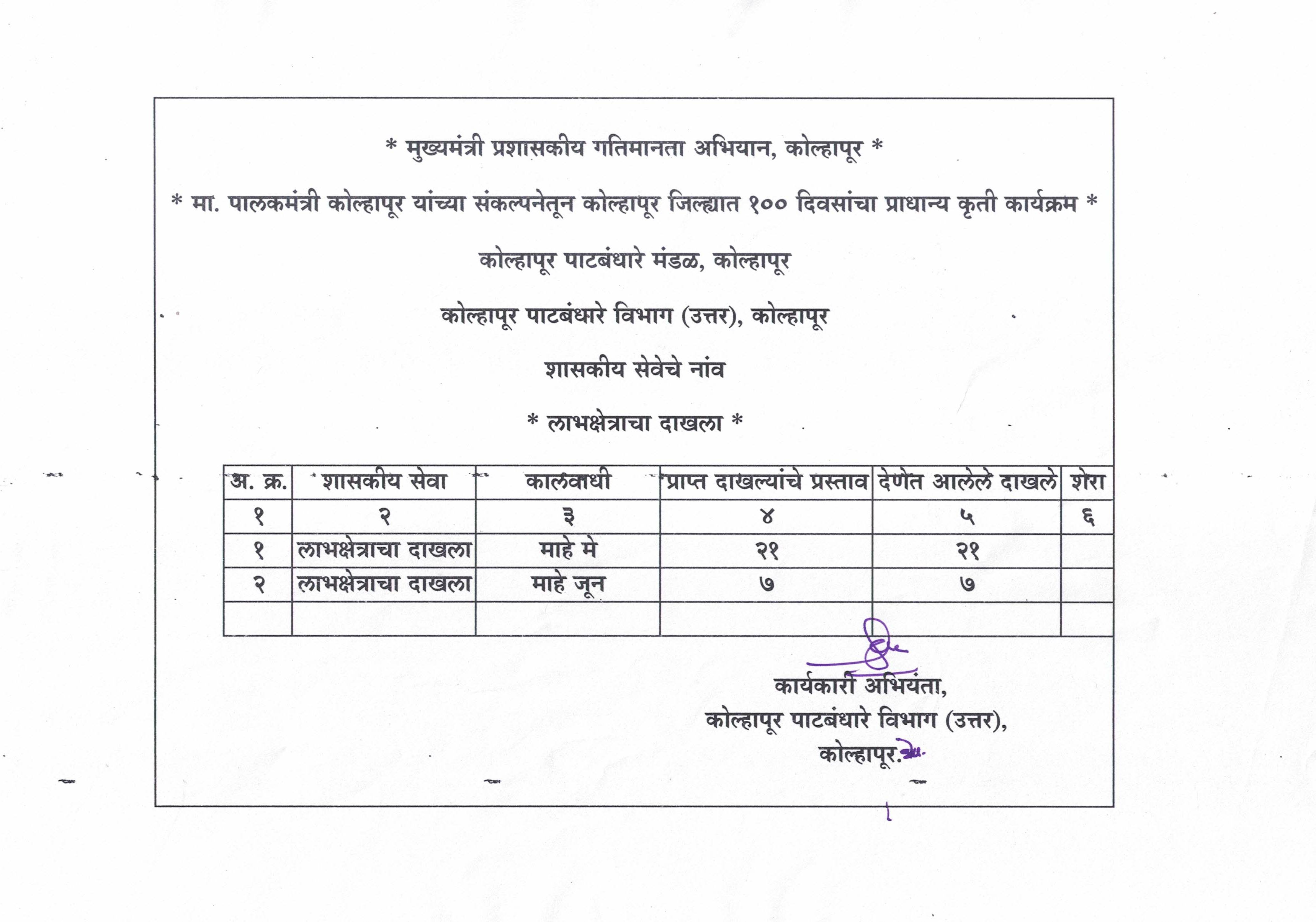 मुख्यमंत्री प्रशासकीय गतिमानता अभियान, कोल्हापूर अंतर्गत मा. पालकमंत्री कोल्हापूर यांच्या संकल्पनेतून कोल्हापूर जिल्ह्यात 100 दिवसांचा प्राधान्य कृती कार्यक्रम कालवाधीत अधीक्षक अभियंता, कोल्हापूर पाटबंधारे मंडळ, कोल्हापूर यांचे अधिनस्त कार्यकारी अभियंता, कोल्हापूर पाटबंधारे विभाग (उत्तर), कोल्हापूर यांचे कार्यालयाकडून विविध शासकीय कामसाठी 28 लाभार्थी यांना लाभक्षेत्र दाखले देणेत आले.
