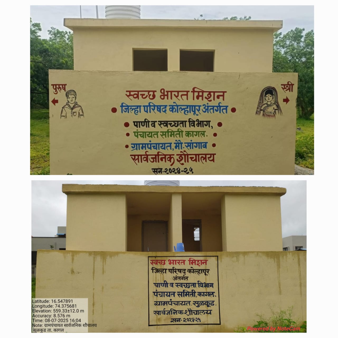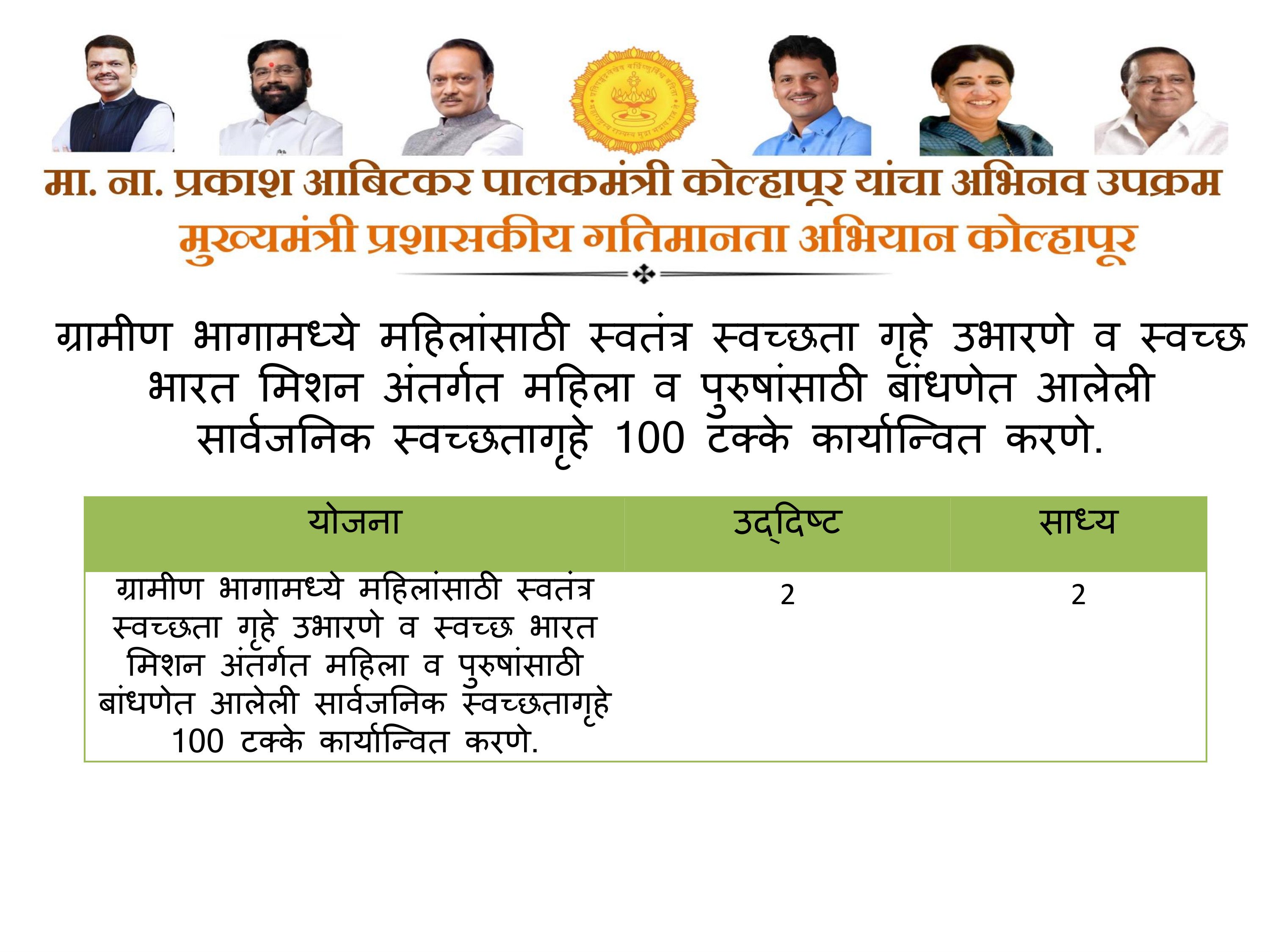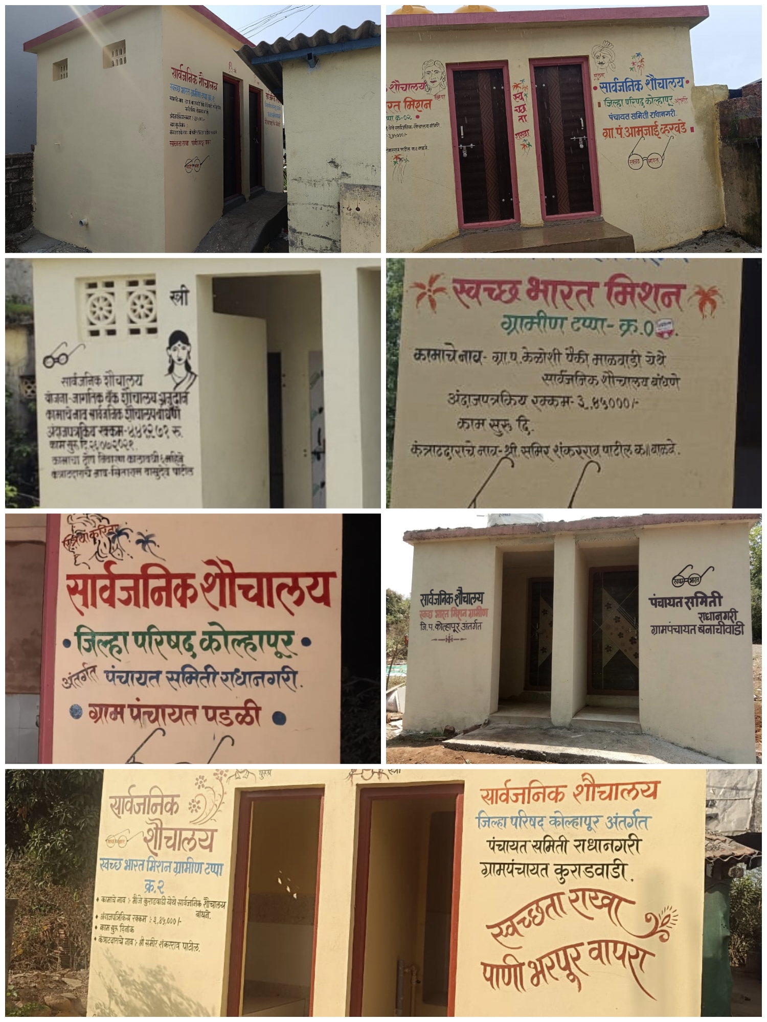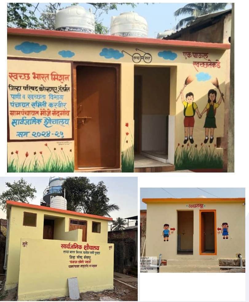 भारत मिशन अंतर्गत महिला व पुरुषांसाठी बांधणेत आलेली सार्वजनिक स्वच्छतागृह 100 टक्के कार्यान्वित करणेत आलेल्या गावांची नावे खालील प्रमाणे,