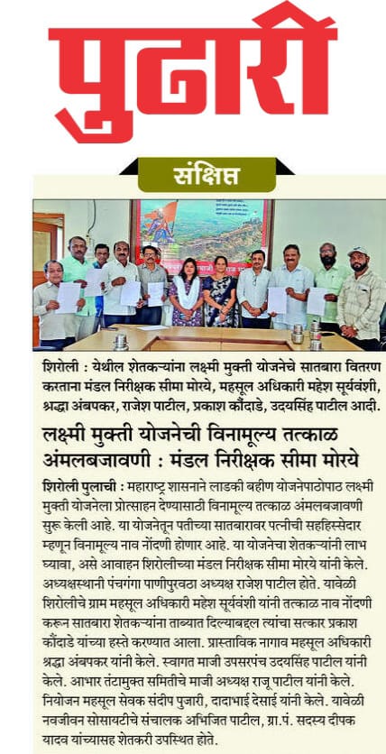 शिरोलीचे ग्राम महसूल अधिकारी महेश सुर्यवंशी यांनी तात्कळ नाव नोंदणी करुन सातबारा शेतकऱ्यांना ताब्यात दिल्याबद्दल त्यांचा सत्कार प्रकाश कौंदाडे यांच्या हस्ते करण्यात आला. प्रास्ताविक नागांव महसूल अधिकारी श्रध्दा अंबपकर