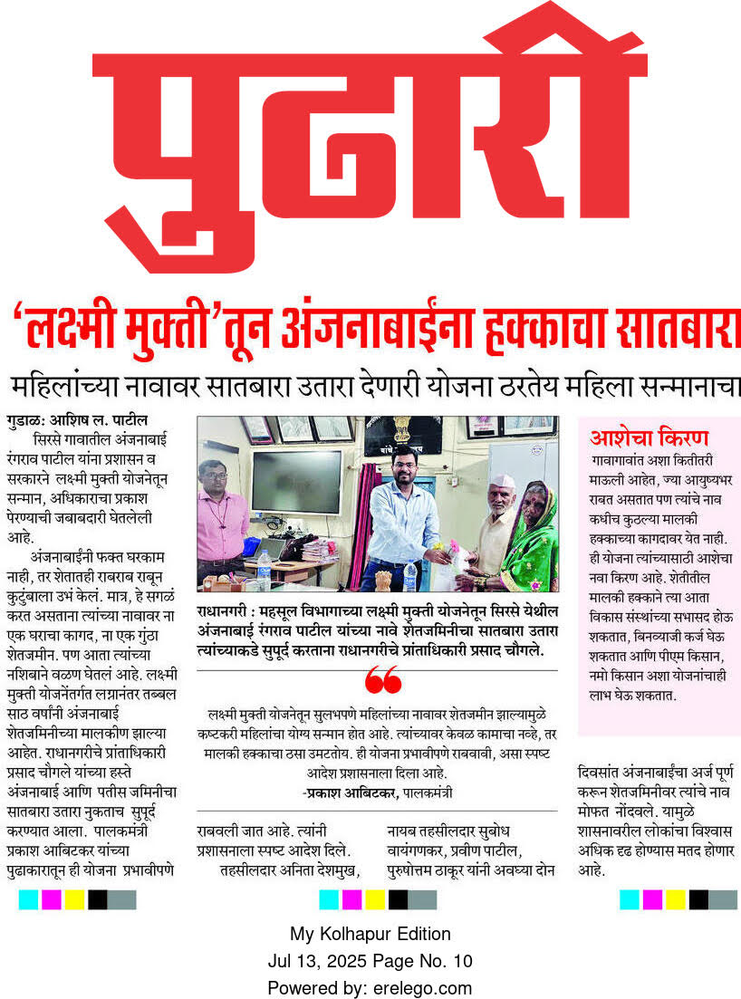 महाराष्ट्र शासनाने लाडकी बहीण योजनेपाठोपाठ लक्ष्मी मुक्ती योजनेला प्रोत्साहन देण्यासाठी विनामुल्य तात्काळ अंमलबजावणी सुरु केली आहे. या योजनेतून पतीच्या सातबारावर पत्नीची सहहिस्सेदार म्हणून