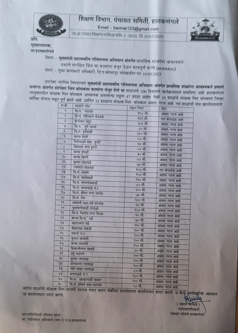 तालुक्यातील एकूण जिल्हा परिषद मालकीच्या 176 शाळां असून त्यापैकी 8 शाळा भाड्याच्या इमारतीत भरतात 133 शाळांना संरक्षक भिंत असून उर्वरित 35 शाळांसाठी ग्रामपंचायती कडे मनरेगा अंतर्गत संरक्षक भिंत मागणी प्रस्ताव सादर करणेच्या सुचना देणेत आलेले आहेत.