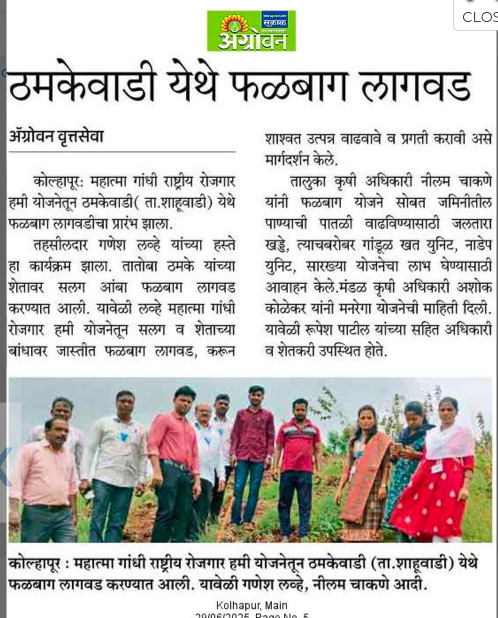 महात्मा गांधी राष्ट्रीय रोजगार हमी योजनेअंतर्गत शाहूवाडी तालुक्यातील मौजे - ठमकेवाडी गावामध्ये कृषि विभाग महाराष्ट्र शासन यांचे वतीने श्री. तातोबा काळू ठमके यांचे शेतावर 0.40 हे क्षेत्रावर सलग आंबा फळबाग लागवड मा. गणेश लव्हे प्र. तहसीलदार शाहुवाडी यांचे हस्ते फळबाग लागवड करण्यात आली. यावेळी लव्हे यांनी उपस्थित शेतकऱ्यांना म. गांधी रोजगार हमी योजनेतुन सलग व शेताच्या बांधावर जास्तीत फळबाग लागवड,करून शाश्वत उत्पन्न वाढवावे, व प्रगती करावी असे मार्गदर्शन केले. नीलम चाकणे, तालुका कृषि अधिकारी यांनी फळबाग योजने सोबत जमिनीतील पाण्याची पातळी वाढविण्यासाठी जलतारा खड्डे, त्याचबरोबर गांडूळ खत युनिट, नाडेप युनिट, सारख्या योजनेचा लाभ घेण्यासाठी आव्हान केले. मंडळ कृषि अधिकारी,बांबवडे अशोक कोळेकर यांनी मनरेगा योजनेची माहिती दिली. यावेळी रुपेश पाटील उप कृषि अधिकारी बांबवडे, मंडळ मधील सर्व सहायक कृषि अधिकारी उपस्थित होते
